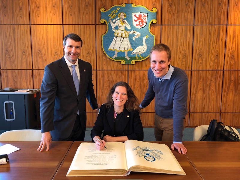Einen ganzen Tag verbrachten die US-amerikanische Generalkonsulin Fiona Evans und Handelskonsul Ken Walsh am 29. Oktober bei einem Besuch in Monheim am Rhein. Im Mittelpunkt des gemeinsamen Kennenlernens und Austauschs standen ein Besuch des Otto-Hahn-Gymnasiums, des Bayer-Standorts an der Alfred-Nobel-Straße, Gespräche mit Wirtschaftsvertretenden sowie eine Stadtrundfahrt mit dem autonomen Bus.