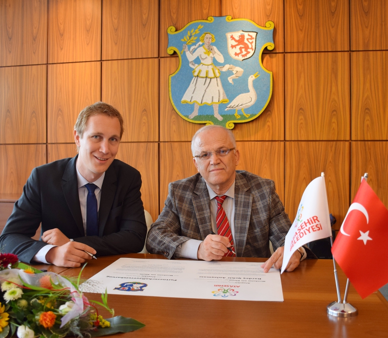 Im bis auf den letzten Platz gefüllten Ratssaal unterzeichneten der stellvertretende Bürgermeister von Ataşehir İlhami Yilmaz und Monheims Bürgermeister Daniel Zimmermann am gestrigen Samstag, 27. Juni 2015 die offizielle Städtepartnerschaft zwischen Ataşehir und Monheim am Rhein.