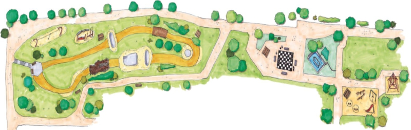 Vorgesehen ist, den dicht zugewachsenen Mittelteil des Grünzugs auszulichten und mit modernen Spielgeräten zu bestücken. Die großen Bäume bleiben erhalten. Im Mittelteil werden ein Großschachspiel und ein Wassertretbecken angelegt. Rings um den Rodelhügel nahe der Friedenskirche und die Wiese im Westteil wird ein Walk- und Bike-Pfad eingerichtet, der sowohl als BMX-Parcours wie auch als Barfußweg und Sinnespfad genutzt werden kann.