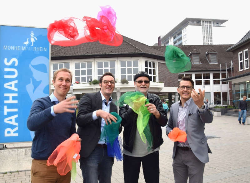 Monheims Bürgermeister wettet, dass es ihm gelingen wird, mindestens 400 Stadtfestgäste am Sonntag vor die Hauptbühne auf der Krischerstraße zu bringen, und dort ab 13 Uhr gemeinsam mit ihm eine kleine Tuchjonglage aufzuführen. Die jeweils drei bunten Tücher, die es dabei hochzuhalten gilt, gibt es von der Stadt gestellt. Sie dürfen anschließend mit nach Hause genommen werden. Kinder dürfen zudem auch mit nur zwei Tüchern jonglieren, wenn ihnen drei zu schwierig sind.
