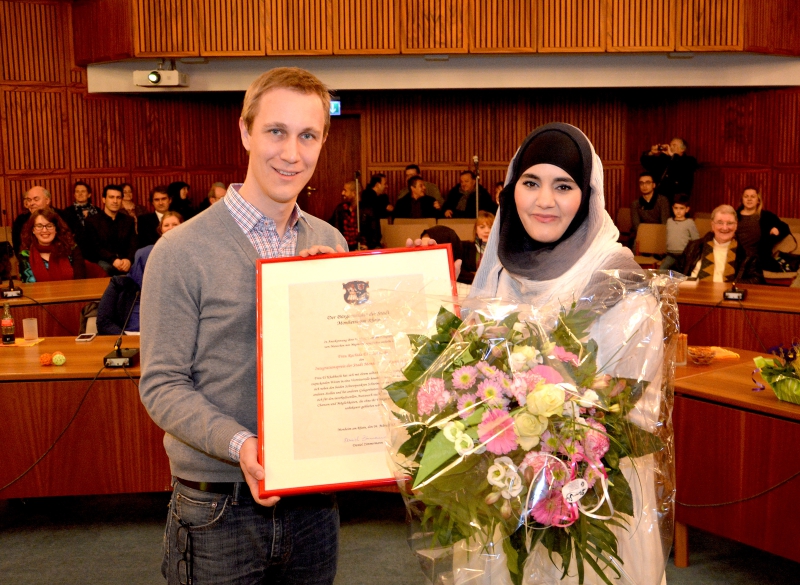 In Anerkennung ihrer Verdienste um die Integration von Menschen mit Migrationsgeschichte überreichte Bürgermeister Daniel Zimmermann den städtischen Integrationspreis für das Jahr 2014 an diesem Mittwoch, 4. März, an Rachida El Khabbachi.