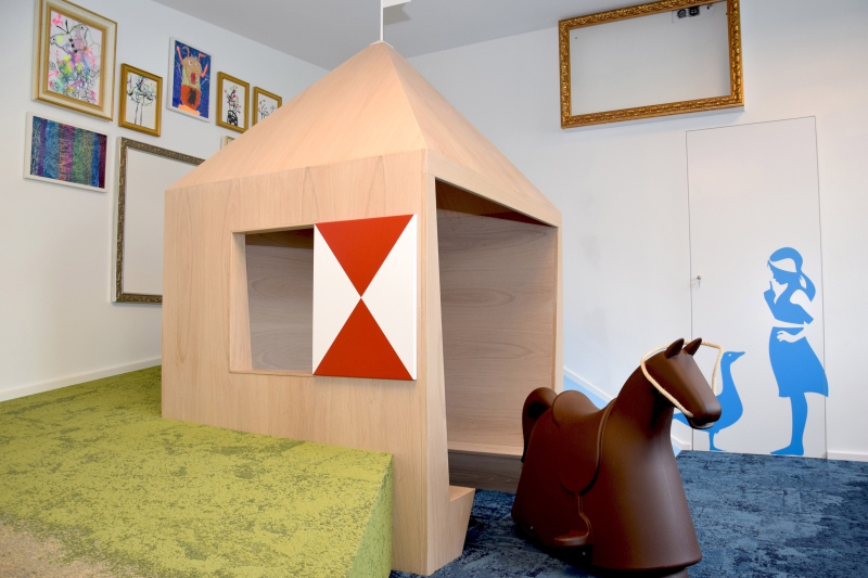 An den Decken hängen Leuchten und Schallschutzelemente in Form von Blumen. Darunter verläuft ein wiesengrüner Boden, auf dem niedergerieselter Blütenstaub den Weg an die Beratungsplätze zu ebnen scheint. Das Entree ist vor allem in ganz viel Weiß und Monheim-Blau getaucht. In der Kinder-Spielecke plätschert der Rhein an einer Miniaturausgabe des Schelmenturms vorbei, während die kleinen Rathausgäste ihre Füße direkt ins „Wasser“ baumeln lassen können. Auch der kostenlos bereitgestellte Passbildautomat wird von blauen Wellen umspielt, deren künftige Funktion es eigentlich sein, Info-Flyer für die Besucherinnen und Besucher bereitzuhalten. Die Beine der Wartebänke im Foyer haben blaue Gänsefüße, und die einzelnen Plätze mit ihren ebenso bunten wie bequemen Sitzschalen tragen Namen wie Buchstein, Weidenkörbchen oder Piwipp, allesamt entsprungen aus den berühmten Romanen Ulla-Hahns, der mindestens literarisch berühmtesten Tochter der Stadt.