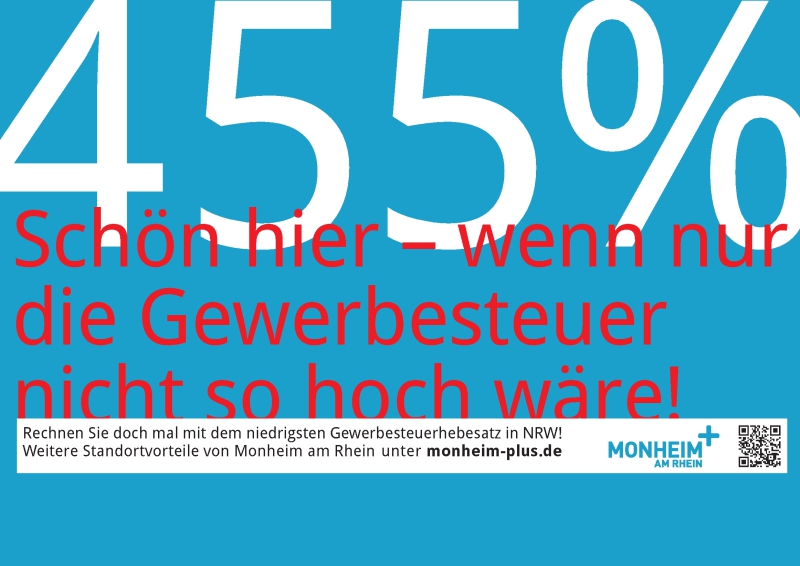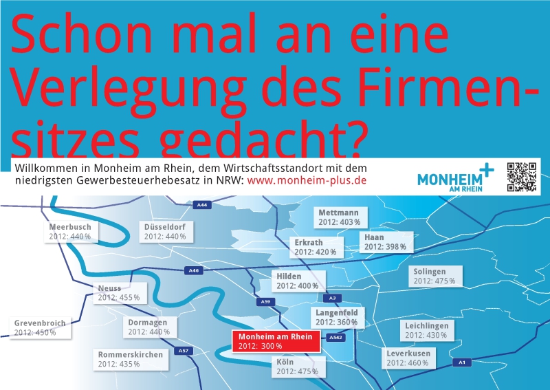 Auf Großplakaten in Düsseldorf und Neuss ist in diesen Tagen folgende Botschaft zu lesen: „Schön hier - wenn nur die Gewerbesteuer nicht so hoch wäre!“ Mit den Plakaten, aber auch mit Anzeigen in der Presse, will die städtische Wirtschaftsförderung weitere Betriebe für eine Ansiedlung gewinnen. „Dabei ist der mit 300 Punkten landesweit niedrigste Gewerbesteuersatz keineswegs unser einziger Standortvorteil. Davon können sich interessierte Unternehmer und Investoren jederzeit persönlich überzeugen“, sagt Bürgermeister Daniel Zimmermann.